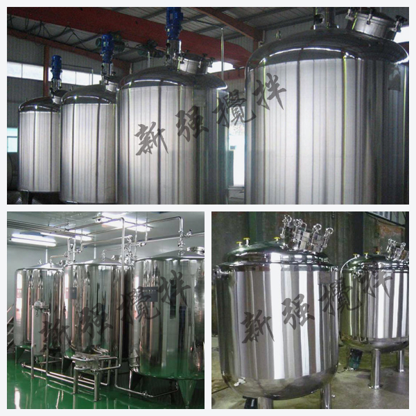 不銹鋼儲罐設備分缸體、缸蓋、進料口、出料口,均由不銹耐酸鋼304或316制成,罐體采用立式或臥式單層或雙層結構,并根據用戶要求充填保溫材料,按GMP技術條件進行,缸體內拋光,外部采用鏡面板或磨砂板保溫。頂部開設進水口、回流口、消毒口、清洗口、人孔并安裝空氣呼吸器, 且可與管道連接,便于連續進各種配料,缸底為錐度,出料口便于放料。